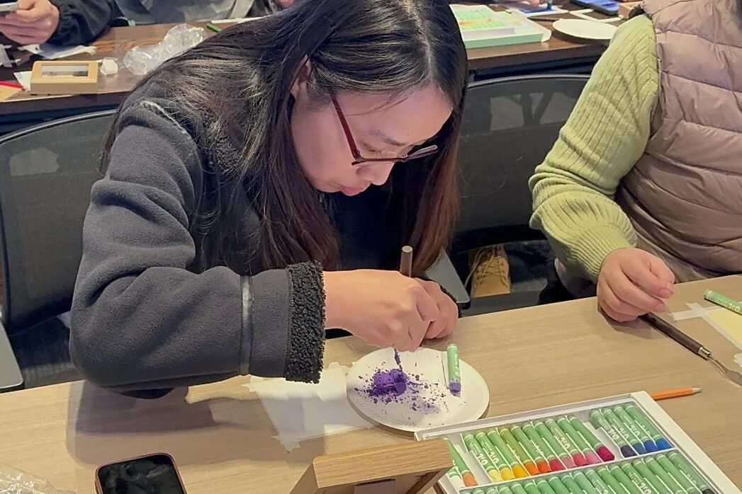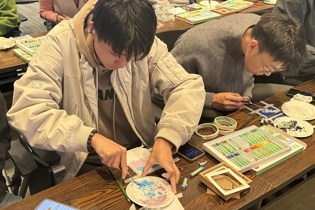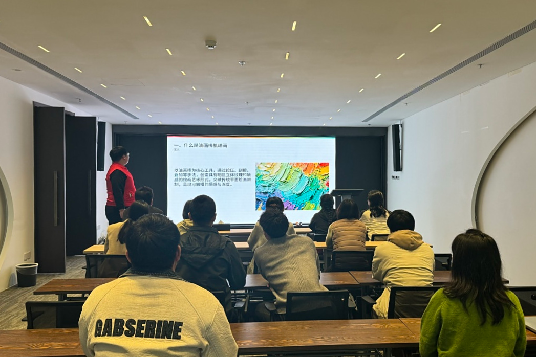 手工创作环节,青年们围坐在一起,挑选心仪的色彩搭配,手持刮刀堆砌色块,用指尖细致调整纹路。在专注的创作过程中,工作的压力悄然释放;在相互借鉴、灵感碰撞的交流中,同事间的距离不断拉近。当一幅幅风格各异、充满个性的肌理画完成时,青年们脸上满是满满的创作成就感,团队协作的温暖与艺术治愈的力量在现场悄然传递,营造出积极和谐的氛围。
