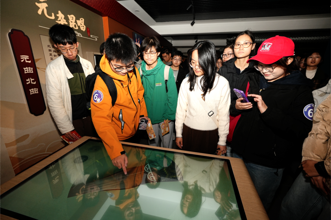 活动首站来到元曲习研所。在这座以“觅古韵·探元音”为主题的现代展馆中,青少年们通过数字化展陈、全息投影、互动问答等方式,追溯元曲的艺术源流及其与北方昆曲的传承关系。大屏幕前的“元曲知识抢答”与“小组趣味赛”点燃了现场气氛,光影交错间,元曲不再只是课本中的文字,而是可听、可看、可感的鲜活艺术。