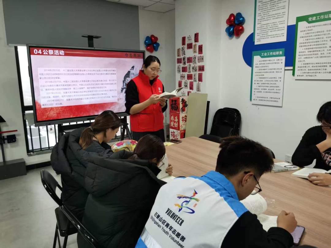 12月12日,五里坨街道新风尚·社区青年汇在金海洋楼宇工作站开展《南京大屠杀》读书会。活动中,社工介绍了国家公祭日设立的背景与意义,带领大家共读《南京大屠杀》相关章节,回顾侵华日军在中国犯下的历史罪行。通过讲述,强调了铭记历史对于当代社会的重要意义,呼吁大家在追思中汲取力量,为中华民族伟大复兴而努力。