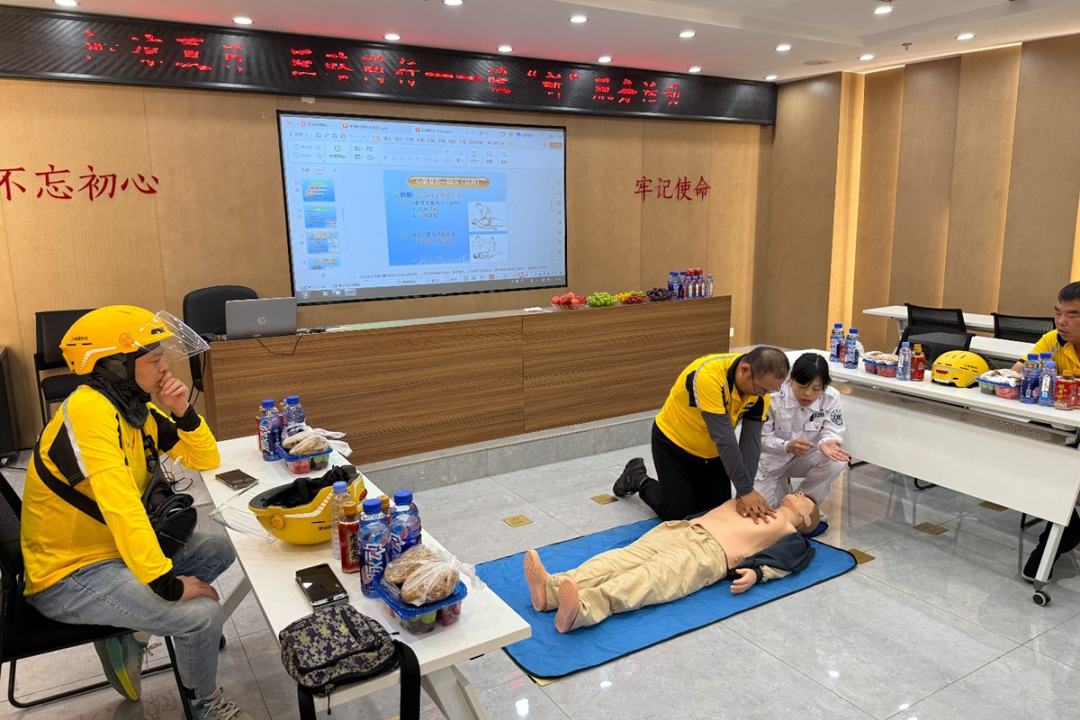 后沙峪镇金成裕雅苑·社区青年汇面向外卖配送员开展了一场应急救护培训。空港医院120急救中心医生手把手教授心肺复苏急救知识与AED使用方法,针对配送途中可能遇到的突发状况,讲解了“黄金四分钟”的急救要领。社工朱敏佳说:“我们希望把急救技能真正转化为每个人的实际能力,而不只是停留在视频知识里。”