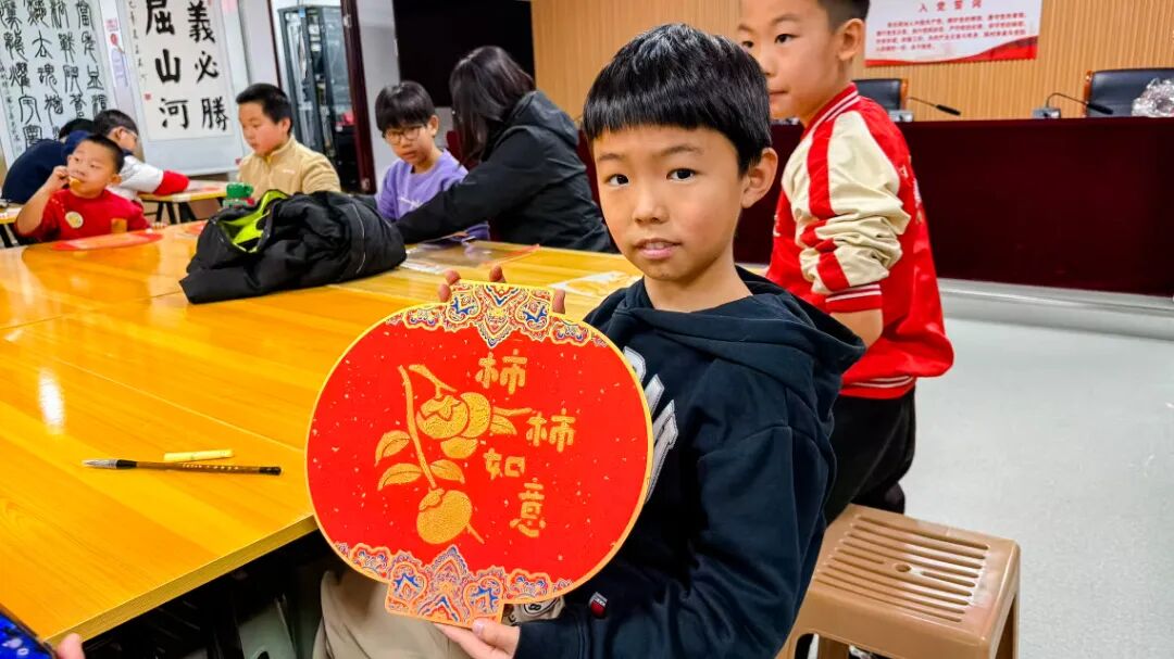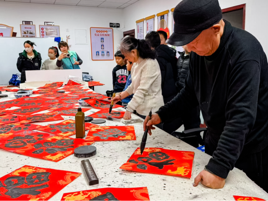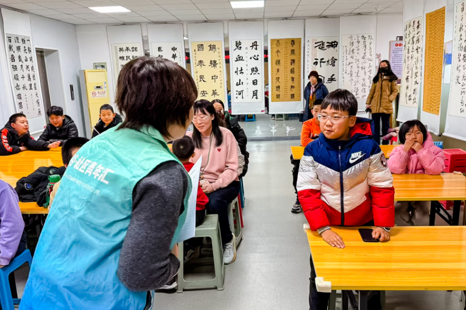 在备受期待的书法环节中,青少年们近距离观摩社区书法爱好者挥毫泼墨。孩子们围在书法桌旁,聚精会神地观看书法爱好者们如何执笔、运笔、收笔,一张张红色的宣纸在笔墨间绽放出一个个饱满的“福”字。