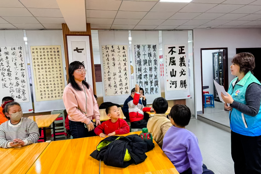 孩子们主动为书法爱好者们准备纸张、研磨墨汁,在协助过程中与书法爱好者亲切交流。“爷爷,这个笔画为什么要这样写?”“老师,不同的字体有什么区别?”面对孩子们的提问,书法爱好者们耐心讲解书写技巧,并带领孩子们回顾篆、隶、楷、行、草五种字体的特点和演变历程。在这一问一答、一教一学中,传统文化的种子悄然播撒在孩子们心中。