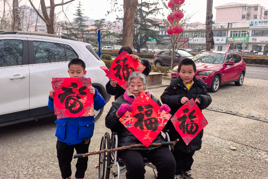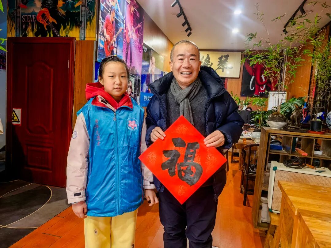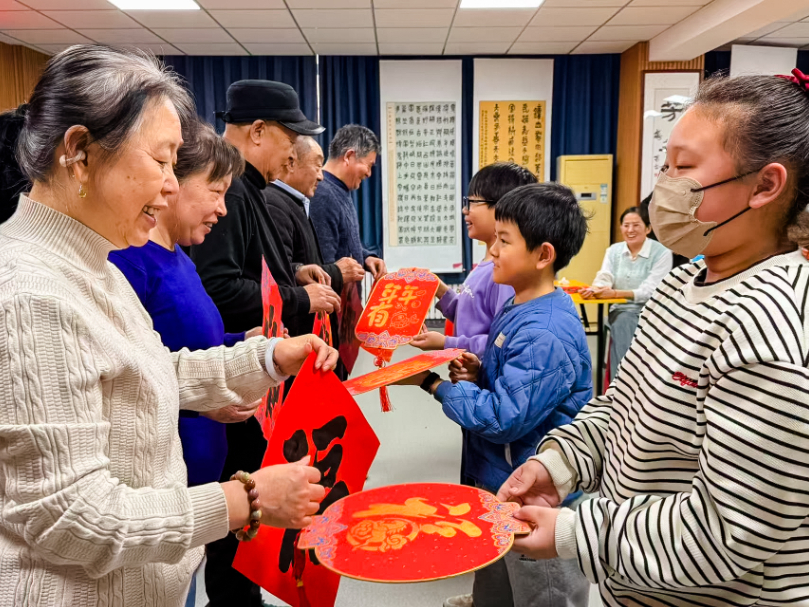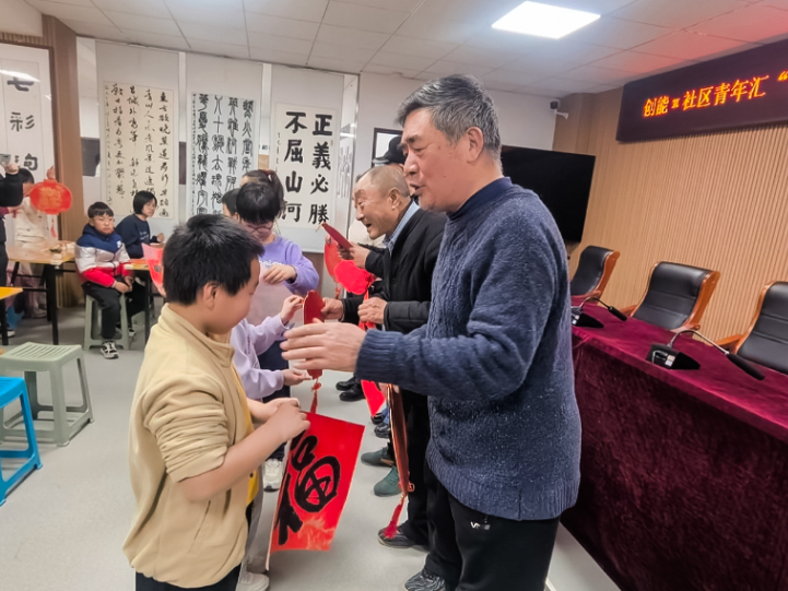 最温馨的时刻当属青老互赠祝福环节。孩子们将自己亲手制作的福字灯笼赠送给书法爱好者,“爷爷奶奶,祝您新年快乐,健康长寿!”书法爱好者们也将自己精心书写的福字作品回赠给孩子们,并送上美好的祝福。这一来一往间,传递的不仅是礼物,更是两代人之间的温情与关爱。