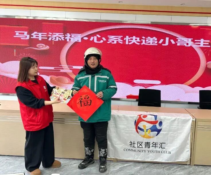 北潞园社区青年汇以“马年添福·心系快递小哥”为主题,设置春节传统文化学习、趣味知识问答、手写福字体验等环节,志愿者将亲手书写的福字送到小哥手中,在传承年俗文化的同时传递新春美好祝福。