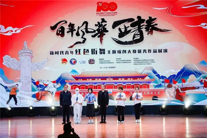 为学习贯彻习近平总书记 在党史学习教育动员大会上的重要讲话精神,在广大团员青年中以喜闻乐见的方式、深入开展“学党史、强信念、跟党走”学习教育,弘扬正能量,传递爱国情,4月28日下午,“百年风华正青春”新时代青年红色街舞主题编创大赛优秀作品展演在北京剧院举行。共青团中央、中国舞蹈家协会、北京团市委、朝阳区委等相关单位领导出席,北京街舞从业青年、爱好者以及各级团组织代表共500人参加此次活动。