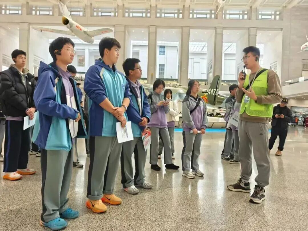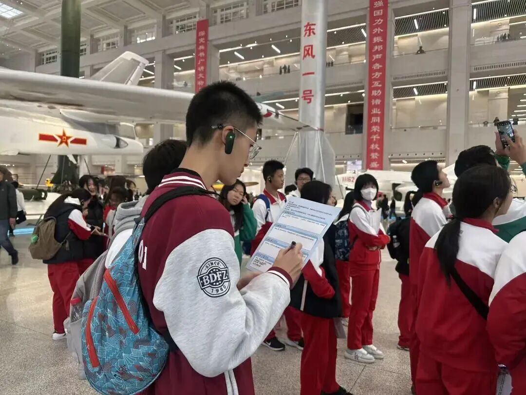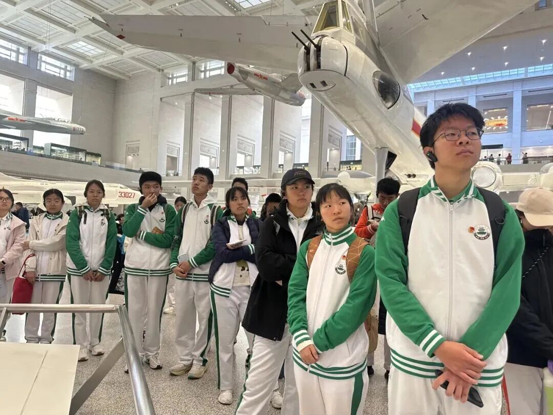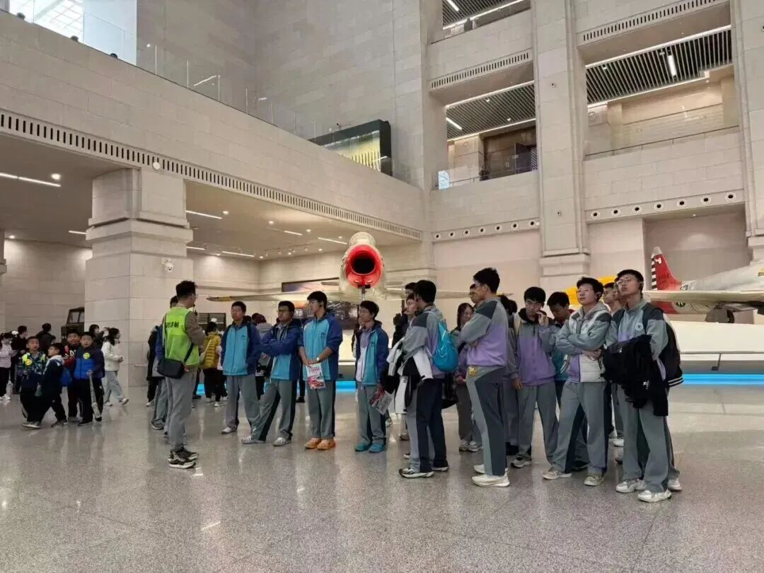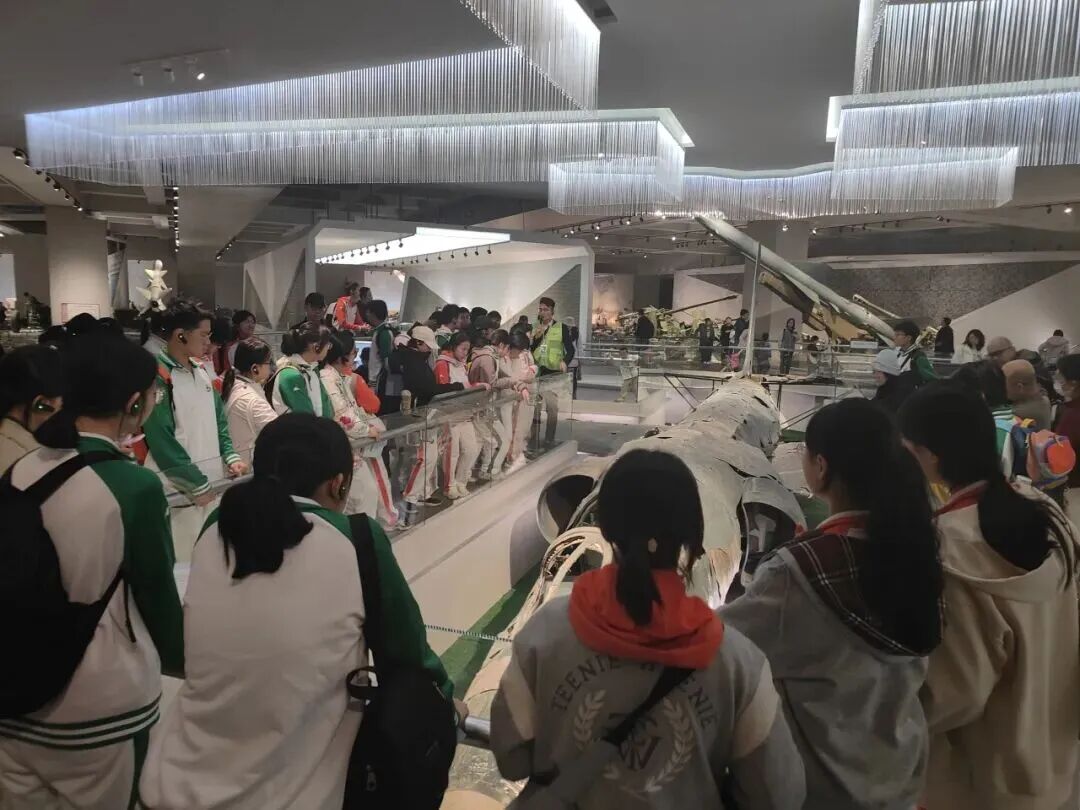 在“抗日战争馆”,破损的战机残骸、手枪等文物让同学们仿佛触摸到先辈的战斗岁月。在“两弹一星”展区,老一代科学家的奋斗与奉献精神,更让同学们感动。回程中,多位同学分享感悟,真挚情感打动带队老师。