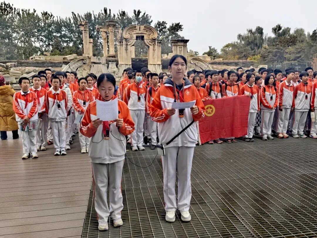 10月30日,首都师范大学附属中学育鸿学校八年级全体师生赴圆明园遗址公园,开展“民族记忆与复兴之梦”行走的思政课主题活动。全体师生先在圆明园博物馆沉浸式学习,观清代瓷器、玉器等文物,聆听讲解老师以“马首归园”的历程讲述文物流失与回归。随后,讲解老师带领大家沿历史轨迹徒步,结合教材,以遗址、残垣为课本讲述圆明园沧桑。在大水法遗址前,同学们列队宣誓,集体朗诵《少年中国说》,铿锵激昂,声震长空。活动结束后,同学们在学习手册上写下感悟,铭记历史,面向未来,民族复兴使命的信念深深烙进青年学子心间。