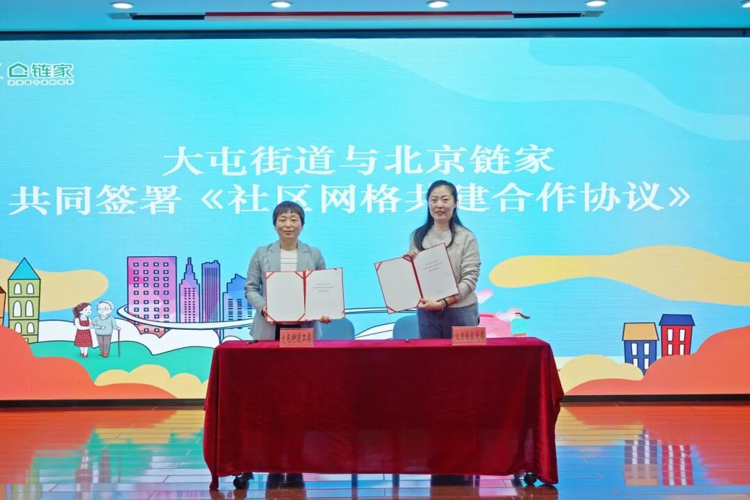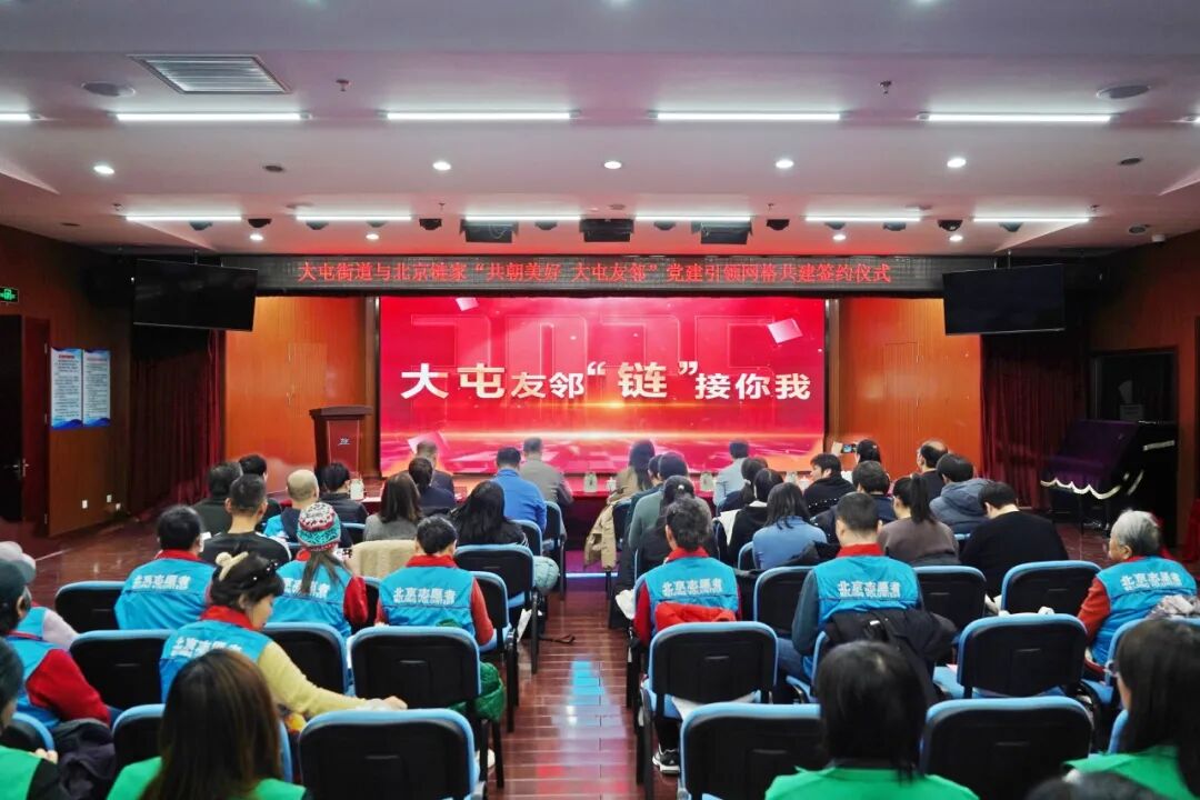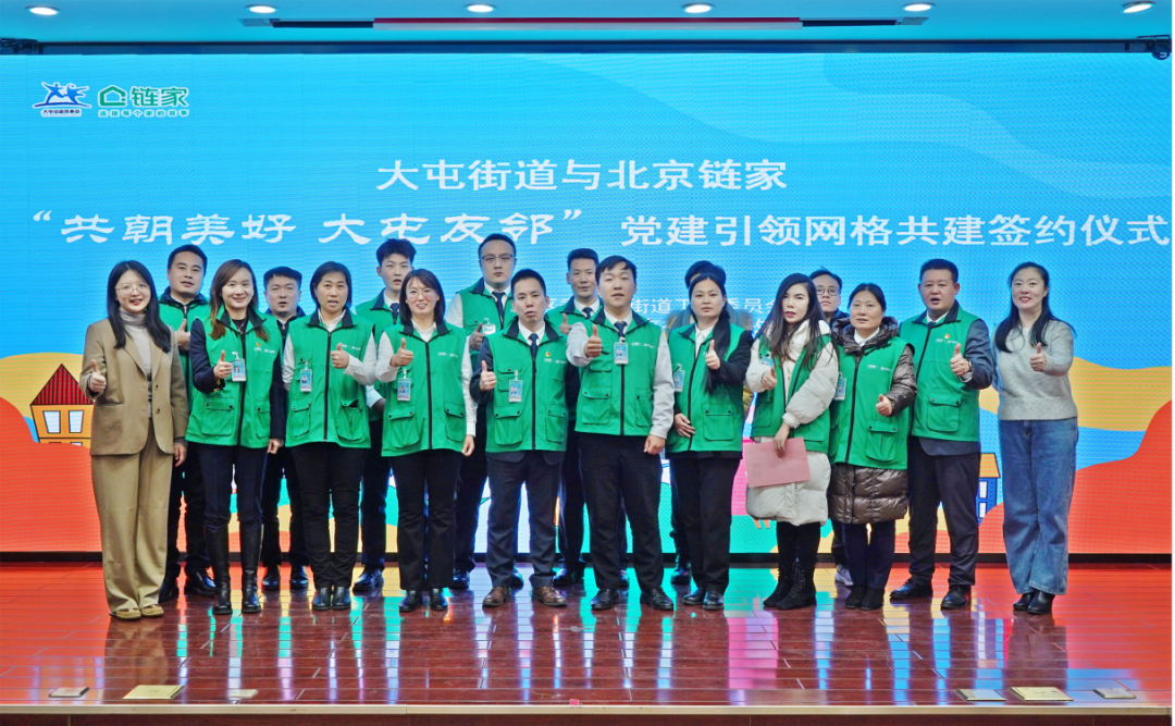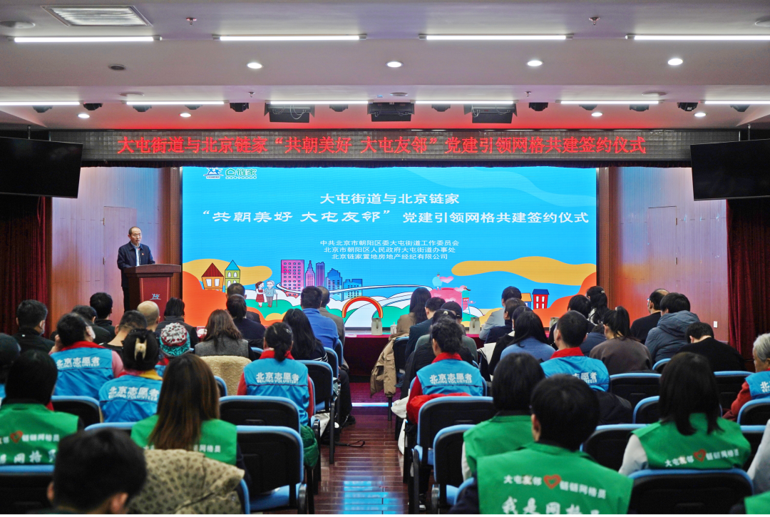 近日,北京链家与大屯街道“共朝美好 大屯友邻”党建引领网格共建签约仪式顺利举行。此次活动旨在深化政企协同,探索以志愿服务力量赋能基层网格治理的新路径。朝阳团区委副书记韩牧岑、中央民族乐团副团长王华宇、行政管理部主任唐大志,大屯街道工委副书记、办事处主任王海玲,北京链家党委副书记王颖,以及各社区党委书记、“北京市五星志愿者”“链链网格员”代表等共同参加。