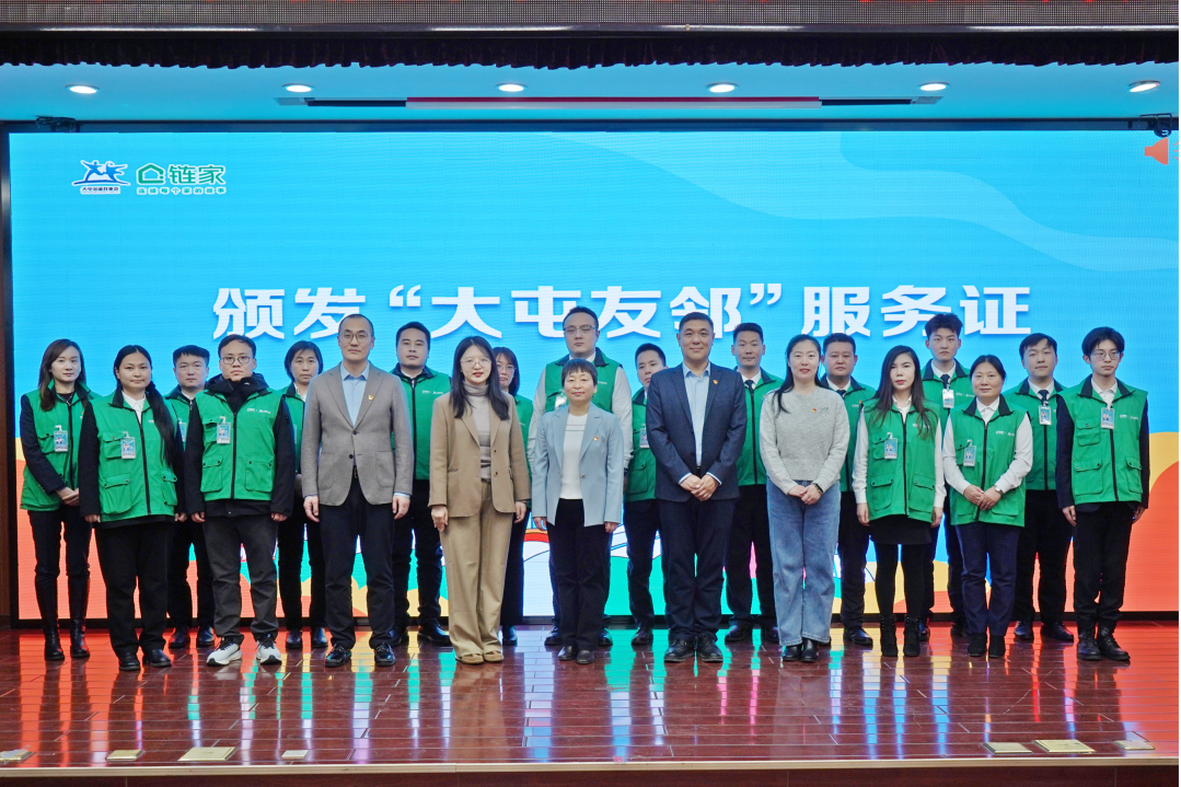 与会领导为首批入网的16名“链链网格员”颁发“大屯友邻”服务证。