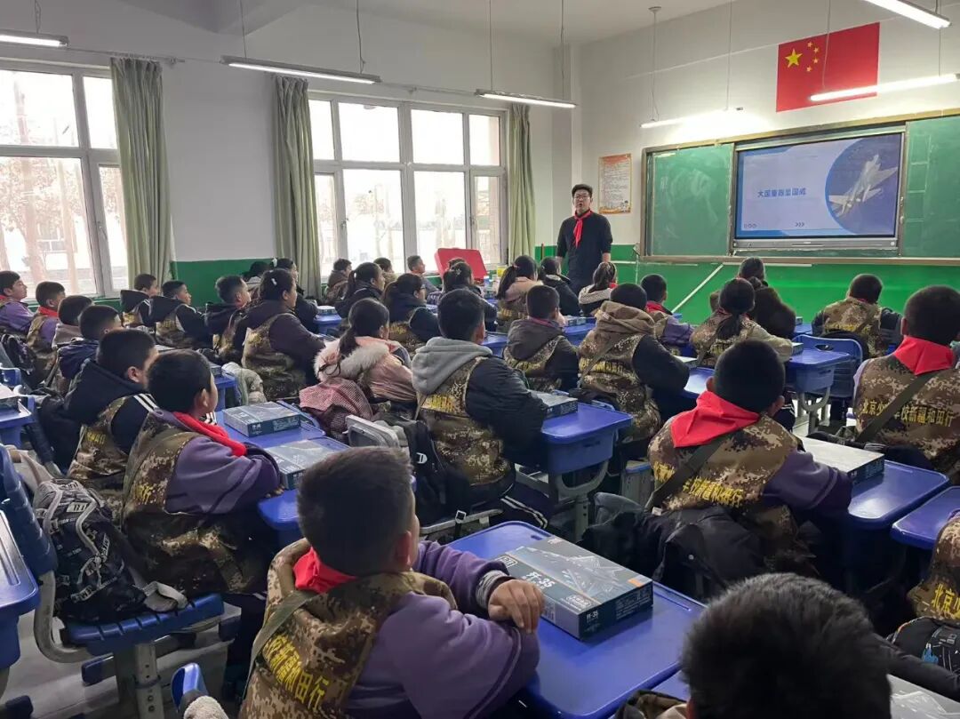 在以“民族团结”为主题的国防教育军事体验课上,来自北京的3名校外辅导员围绕“光荣的少先队员”“长征精神永传承”“大国重器显国威”与少先队员们互动交流;在实践体验环节,同学们分工协作,制作出一个个精美的歼-35飞机模型;在文化传承环节,队员们手握竹简,书写“各民族像石榴籽一样紧紧抱在一起”。