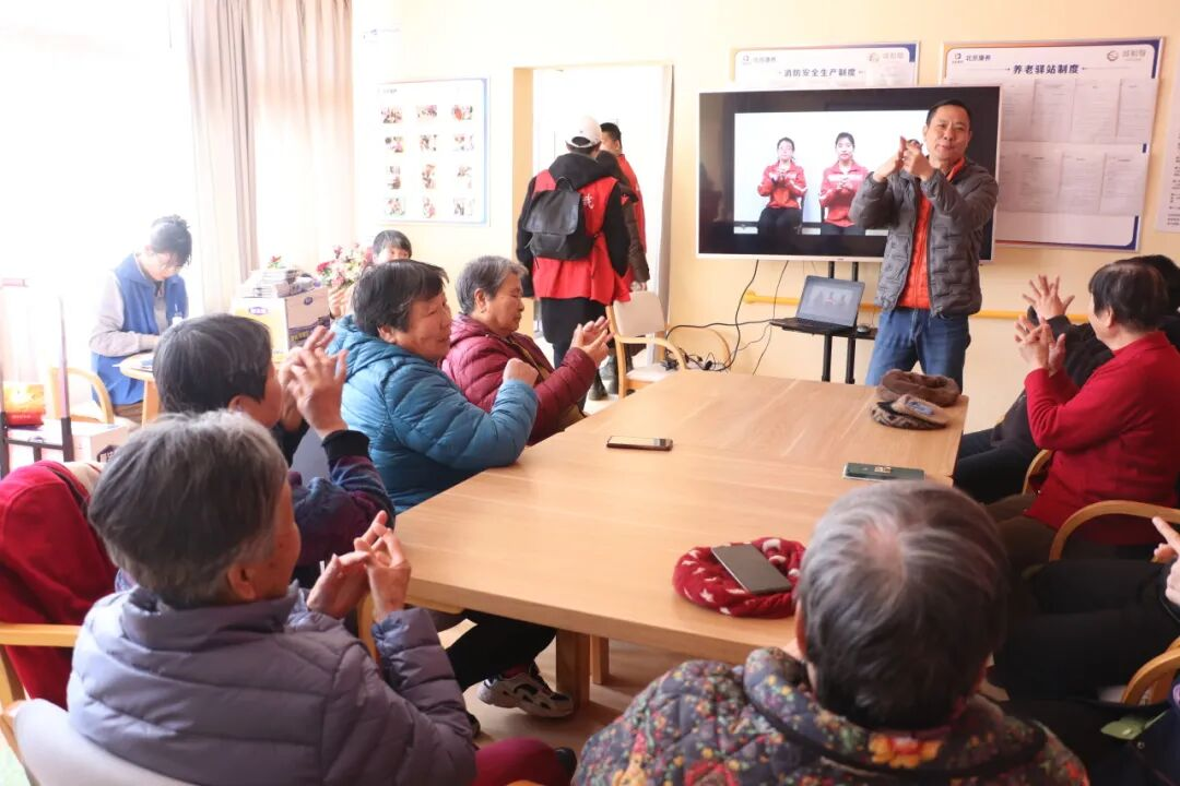科技助老志愿者在村委会活动室耐心教老人们使用智能手机和AI工具,帮助老年人跨越“数字鸿沟”。除此之外,他们还组织10余位老人在村委会大院做起“椅子操”,带领老人活动肩颈、手腕,讲解简单实用的养生小妙招。