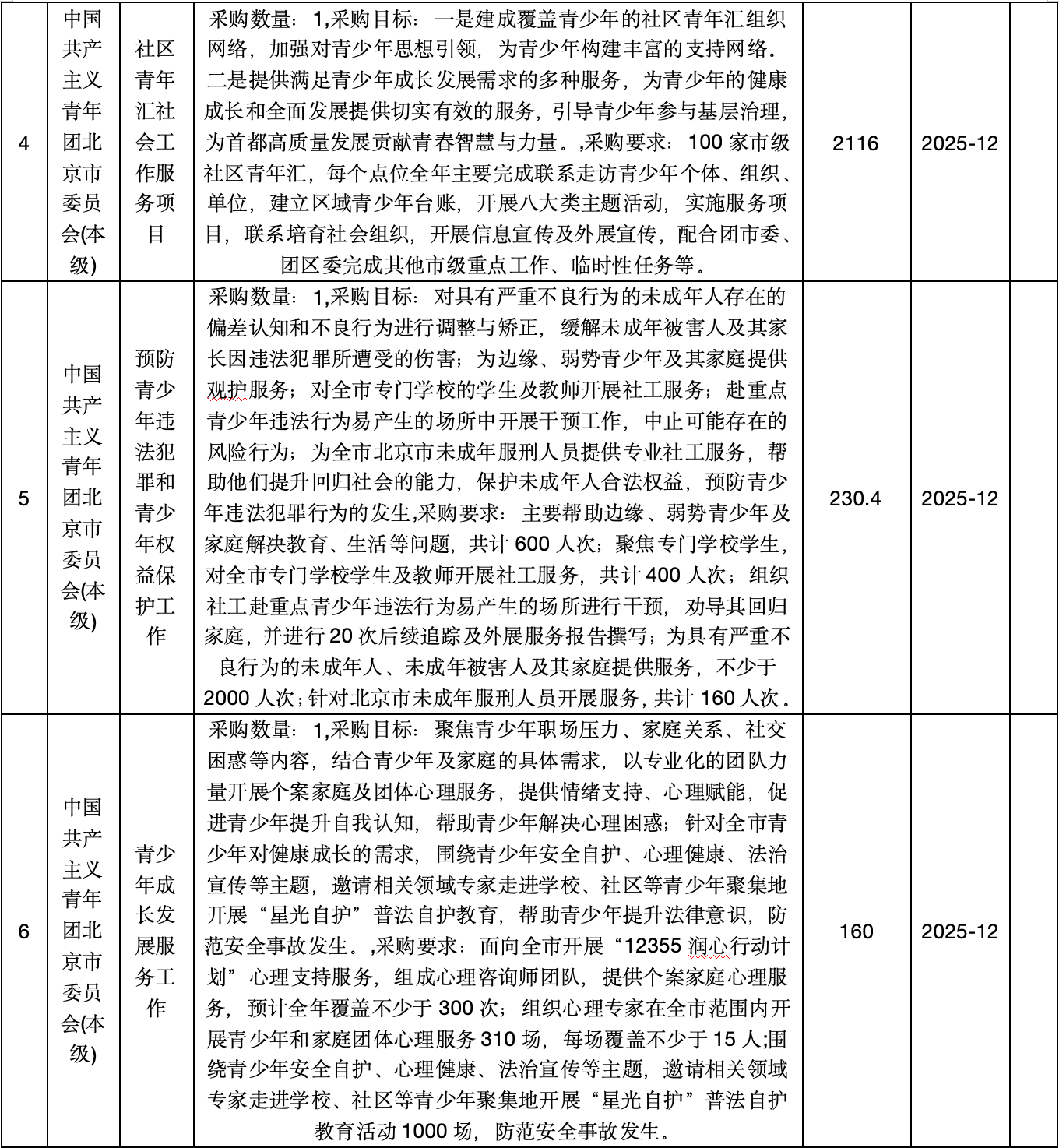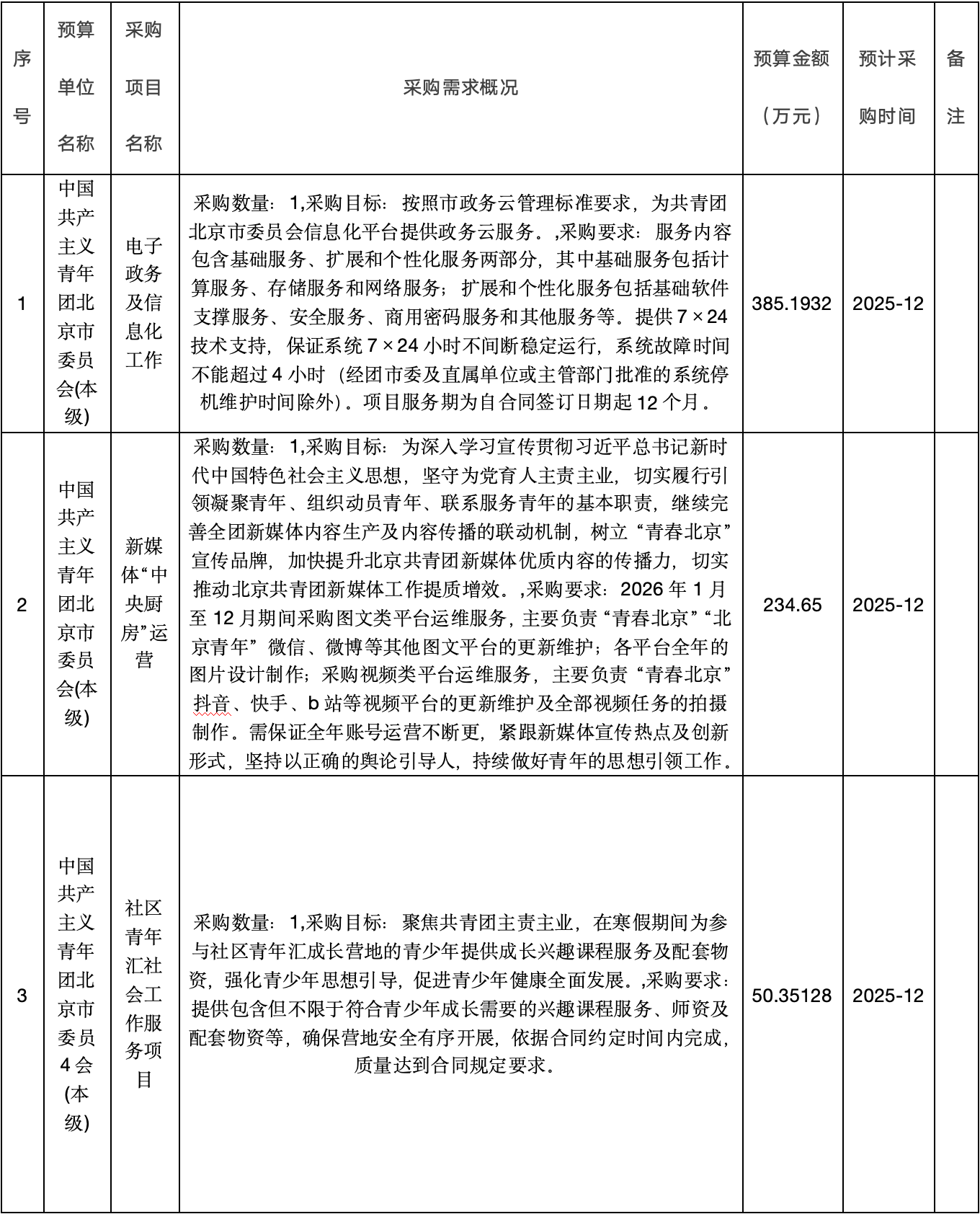 为便于供应商及时了解政府采购信息,根据《财政部关于开展政府采购意向公开工作的通知》(财库[2020]10号)等有关规定,现将中国共产主义青年团北京市委员会(本级)2025年1(至)12月采购意向公开如下: